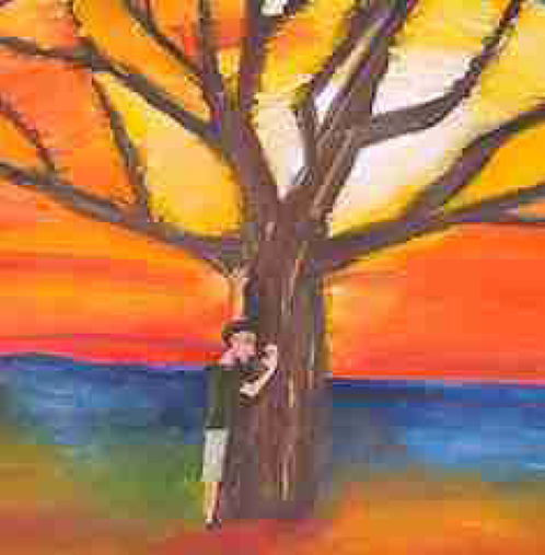 Soon, he was back at the big tree in his family's court yard. It was still night as he had left it, but now the sky was lit up as never before by that same crescent moon. His clothes had dried, and the door to his place was still cracked open as he had left it. When he went inside, his parents were still at the dinner table. His father looked up from his drink. "Who was that at the door?" The boy wasn't sure what to say, so he asked them to come outside. There's a tree, he told them. Reluctantly they followed. When he came to where the tree had been there was nothing, only a small mound of dirt. His mother said "there has never been a tree here." "He's only fooling us," his father said. "Come on, it's getting late, and the air is bad at night." The boy let them go inside and waited a moment. He realized that he still had the pinecone in his pocket, and he smiled as he sang the bear's song and planted the pine cone in the ground, right there, where he knew the tree should be.